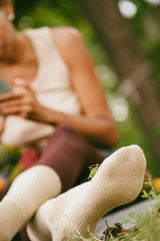 The additional cuff means they fit perfectly on the foot and do not slip; they fit quite tightly but still do not leave any unpleasant marks. The material always contracts a little when washed and expands again when put on again and adapts to the foot. The socks can withstand repeated use (modern ballet dancing on stage) and many washes and have a long service life and remain colourfast. The soles of the socks are thickened on the inside with a type of terry cloth, which gives the impression of walking a little softer or having more “grip”. Similar to Nike sports socks, but which are always rented and always have a logo. The nice thing about these socks is that they have absolutely no print, logo or size information or are visible on the outside. Classy without being showy, understated, simply good. The high proportion of natural material means they can also be dyed easily, and the range of colours available to buy is amazing. If you buy these socks, which aren't exactly cheap, you'll have a classy little piece of clothing that will last a long time. You'll probably notice... that I'm convinced ;) ... if the socks were available in the same form... as sneaker socks, that would be the absolute highlight.